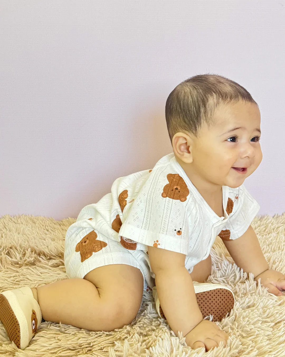 Baby wearing a white outfit with brown bear prints on a beige surface