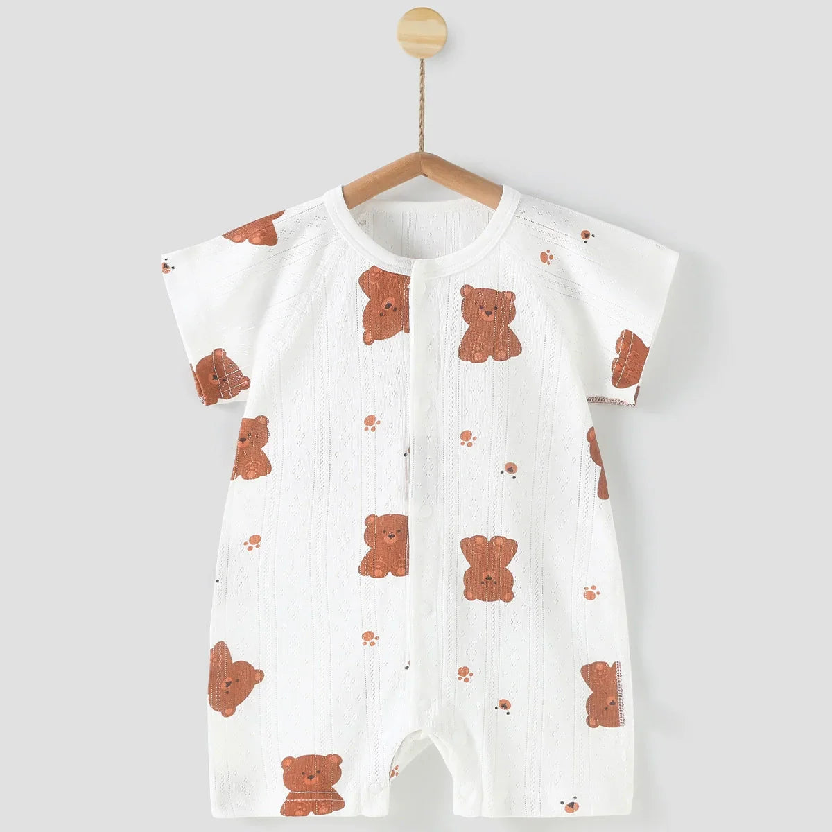 Baby romper with bear pattern on a hanger against a white background