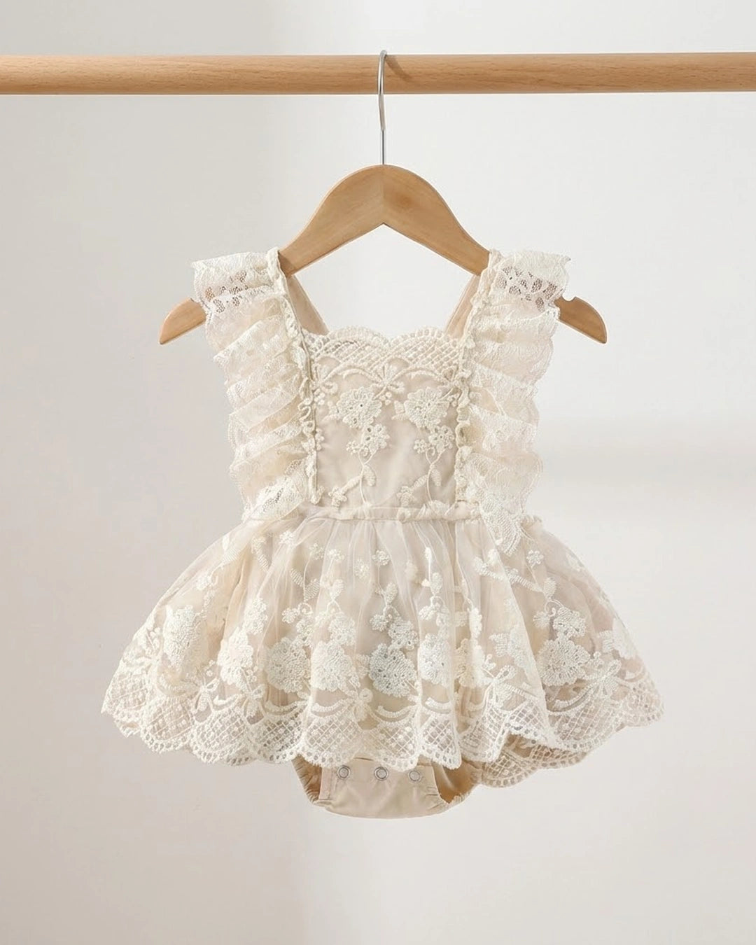 Design Features: Adjustable Cross-Back Straps, Layered Lace Skirt, Elastic Cuffs
