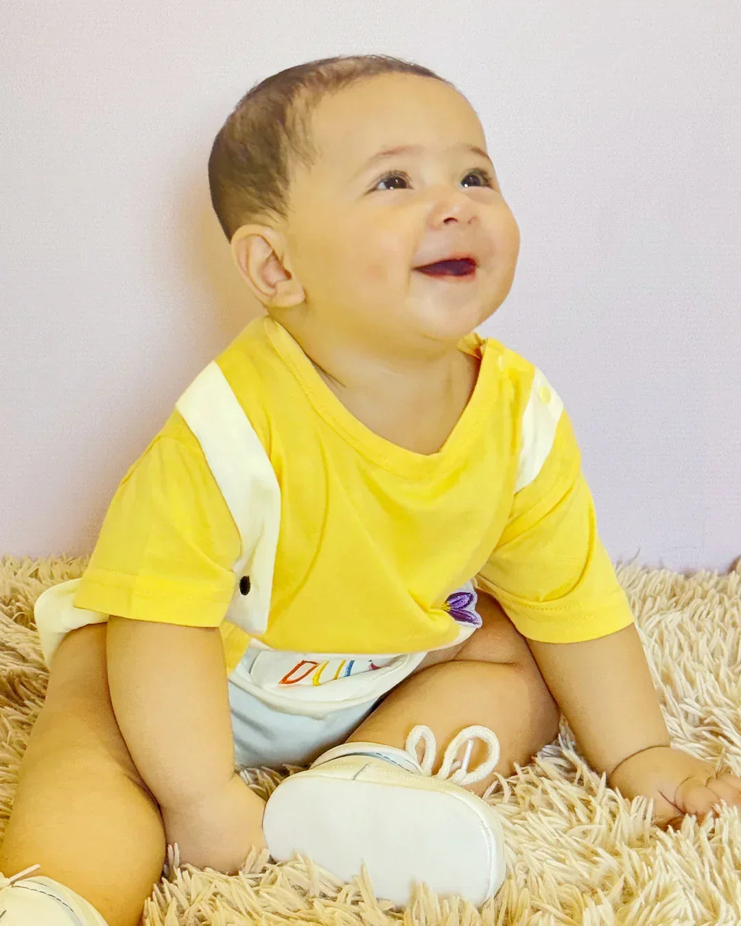 Baby wearing a yellow shirt sitting on a textured surface with a plain background