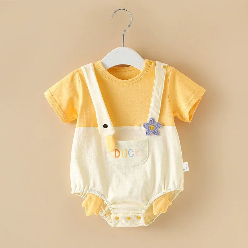 Baby wearing a yellow shirt and white diaper with 'DUCK' printed on it, sitting in a wicker basket.