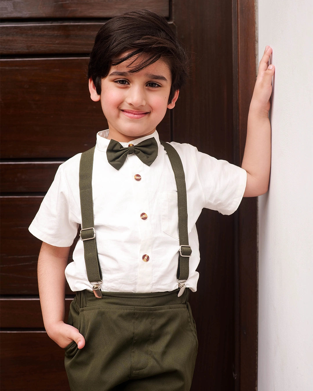 Gentleman Look: Bow tie and suspenders for a dapper appearance.