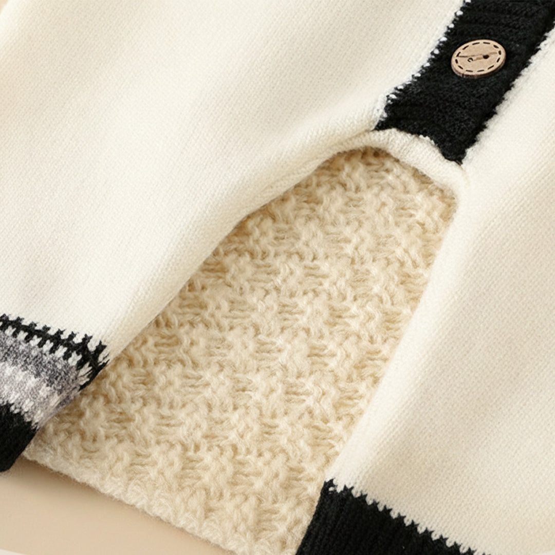 • Pattern: Nordic-style jacquard across the yoke and cuffs, full contrast button placket, rib-knit edges, and matching knit hat with pom