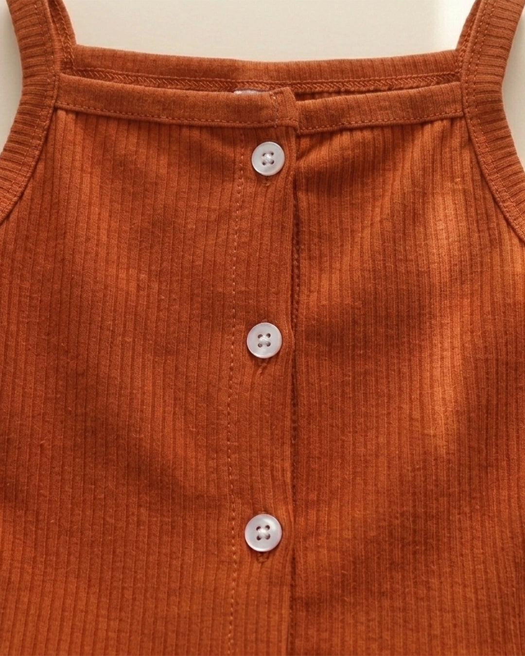 White sleeveless top with button details on a beige background