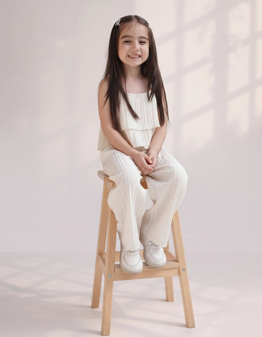 A young girl wearing a beige pleated cami top with spaghetti straps and a wide-leg pant co-ord set, accessorized with a headband and a woven basket.