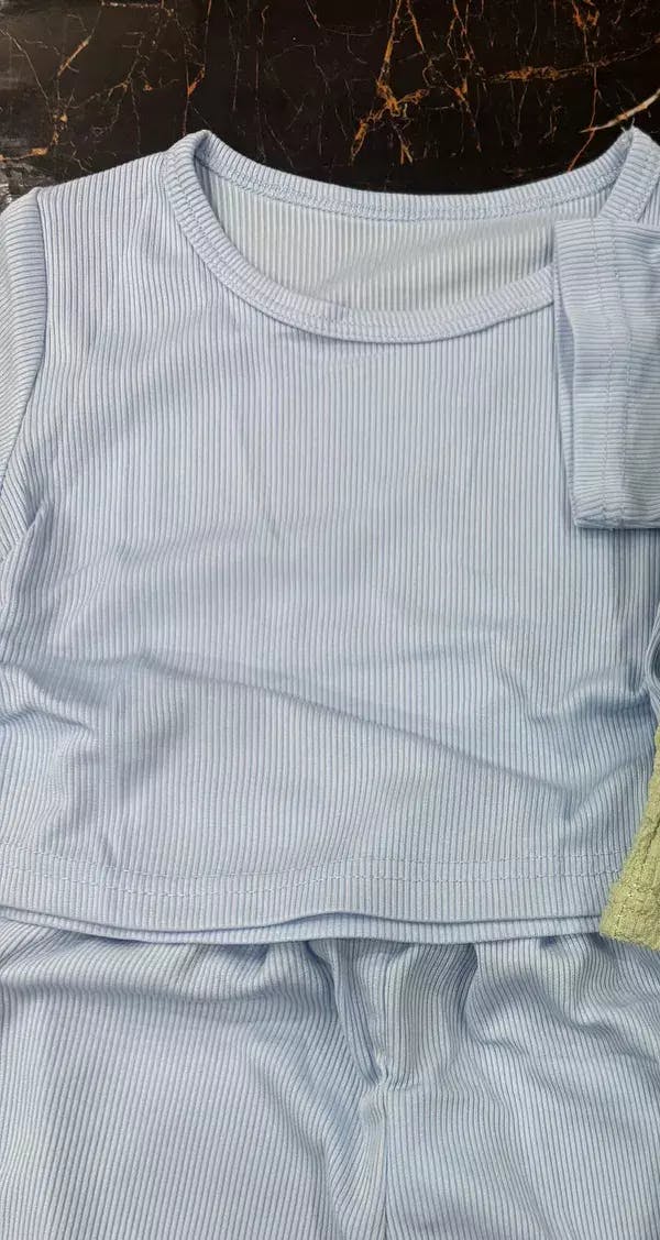 Light blue outfit with matching top and pants on a wooden surface with accessories.